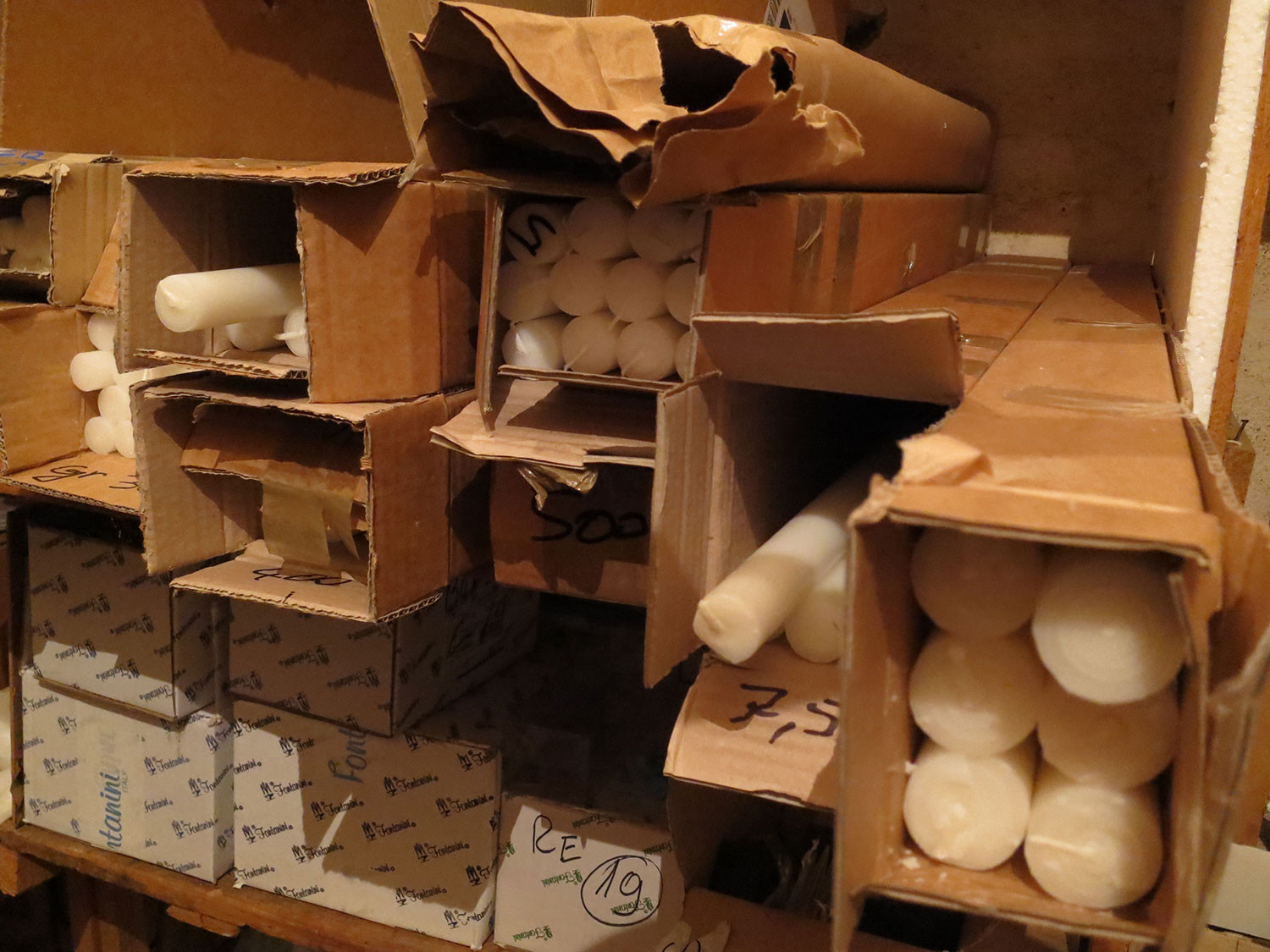 Candele da altare in cera d’api o paraffina, candelotti non gocciolanti, tea lights fabbricati in Italia o in Germania, in cera bianca o alla citronella, fiaccole, flambeaux, lucerne a cera liquida, lanterne, luminelli per lampade a olio, stoppini di ricambio.